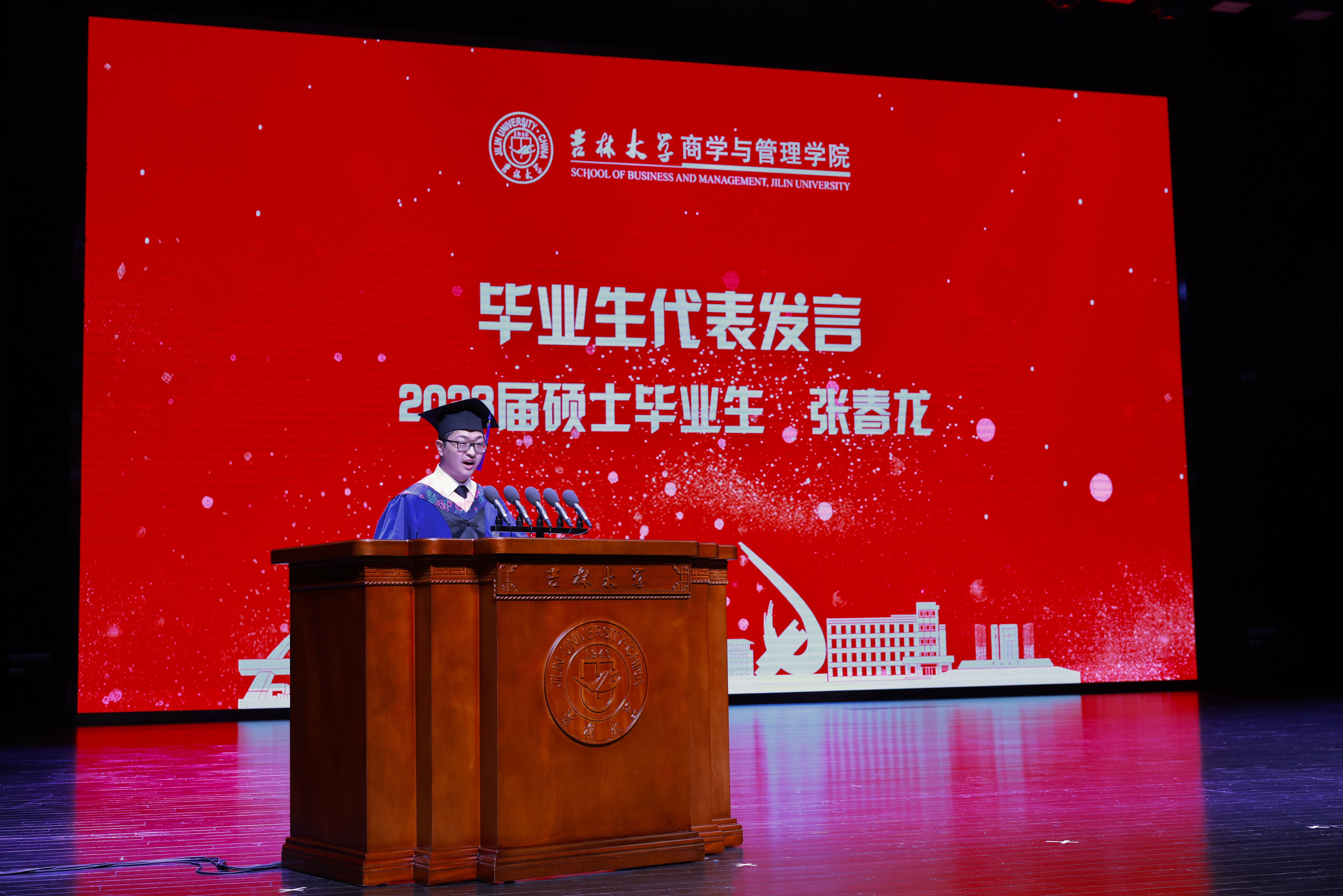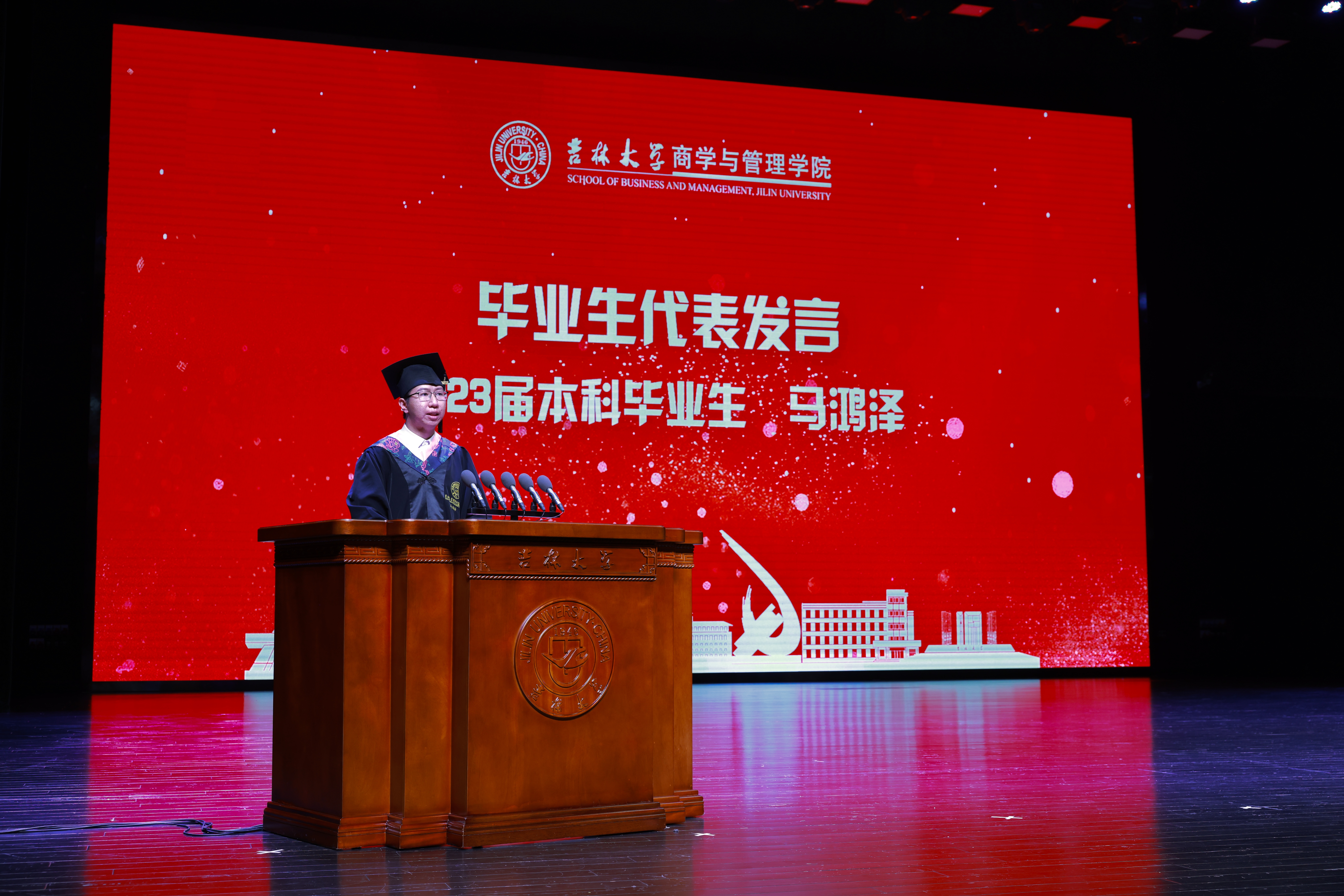 本科毕业生代表、太阳集团官网十佳大学生、2023届信用管理本科毕业生马鸿泽同学进行了发言。马鸿泽同学特别感谢了母校对自己的培养。身为党员,他强调“红”与“专”是吉大人身上永不磨灭的“根”与“魂”;面对未来,他提出将“求实创新”“励志图强”的吉大精神贯彻到学术与生活中去,潜心贯注创新科研,积极向上规划生活,不负时代,共创未来!