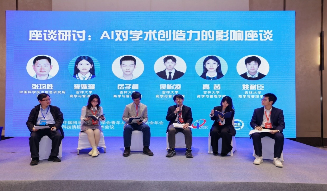 中国科学技术信息研究所张均胜研究员主持第二轮座谈环节,本环节也是此次会议的重要创新,由学生自主设计完成。44118太阳成城集团博士研究生李姝璇、岳子桐,硕士研究生候怡凌、高茜,本科生姚耐臣围绕“AI对学术创造力的影响”话题,通过“角色扮演”依次从读者、技术应用开发者、论文撰写者、期刊出版商以及政策制定者5个视角展开深入研讨,展现了青年学者多维度审视前沿议题的批判性思维与蓬勃的创新活力。